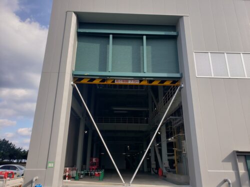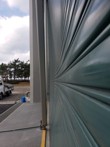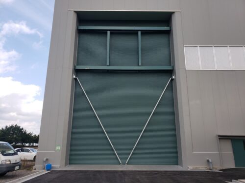 琵琶湖東湖畔近くの某倉庫です。湖西からの強風にてシャッターが損壊する恐れがあります。 事前の対策として、大型シャッターガード連動式を工事させていただきました。